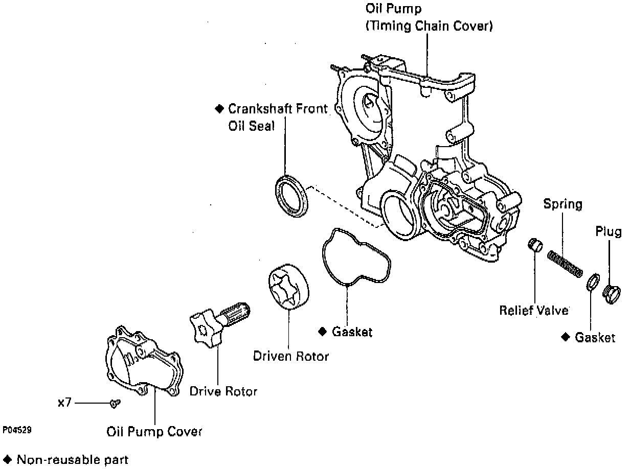 Remove the 7 screws, pump cover, drive rotor, driven rotor and gasket.