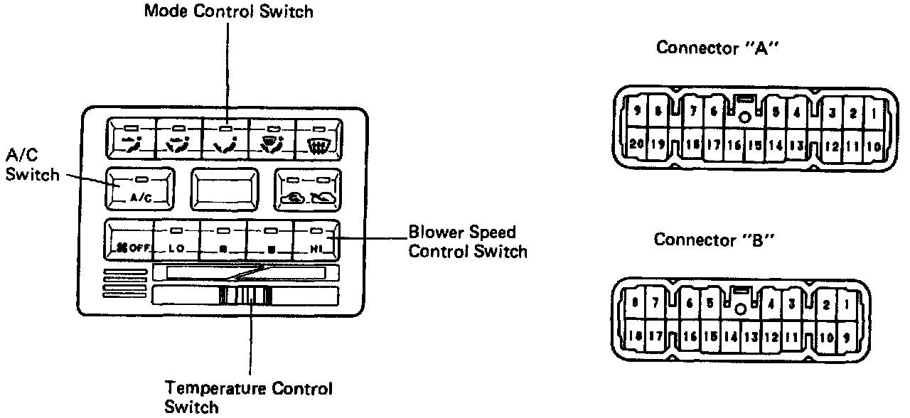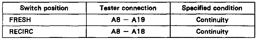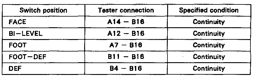 Check that there is continuity between terminals B-6 and B-17 intermittently each time the A/C or DEF switch button pressed.