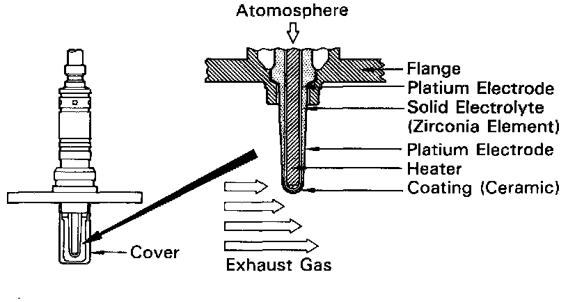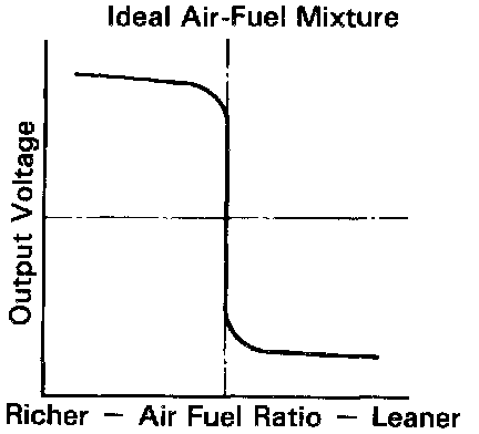 The oxygen sensor has the characteristic where by its output voltage changes suddenly in the vicinity of the stoichiometric air-fuel ratio. This characteristic is used to detect the oxygen concentration in the exhaust-gas and provide feedback to the computer for control of the air-fuel ratio.