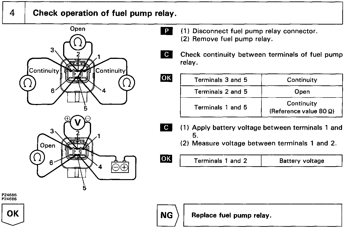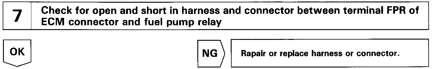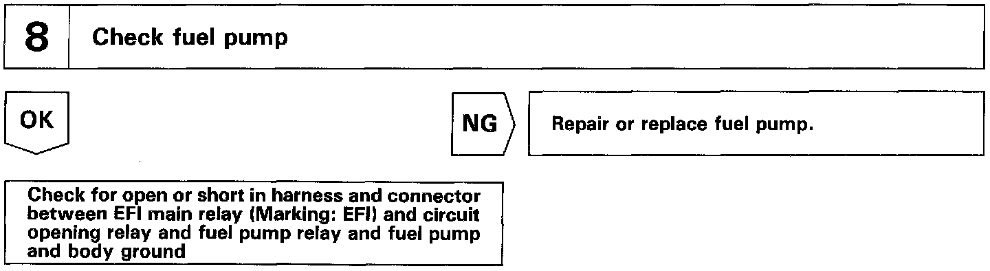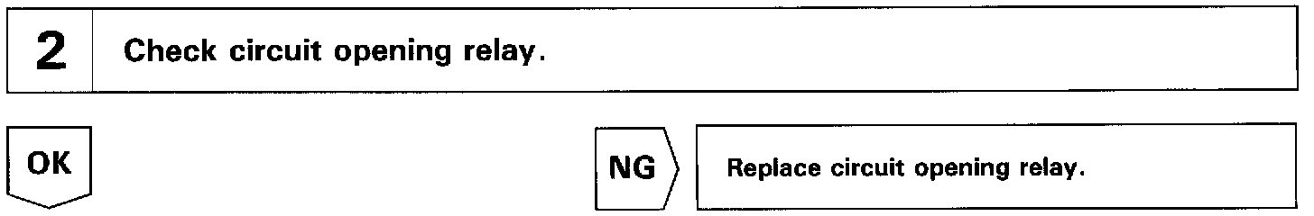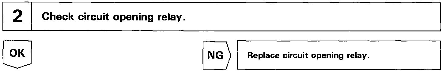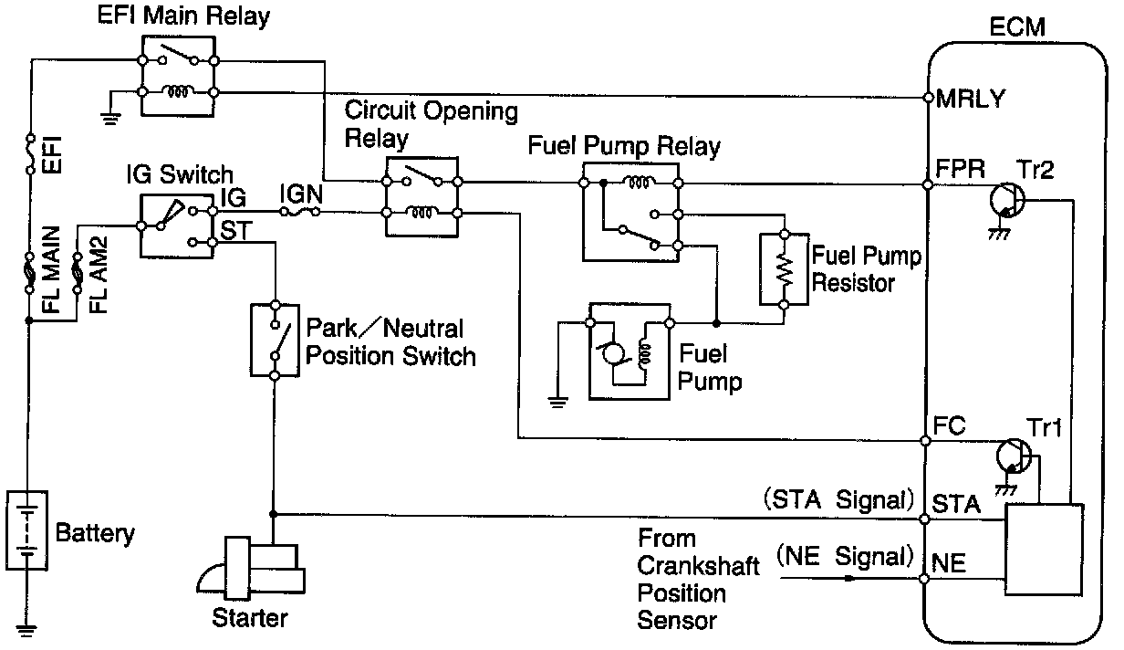When the STA signal and NE signal are input to the ECM, Tr1 is turned ON, current flows to coil of the circuit opening relay, the relay switches on, power is supplied to the fuel pump and the fuel pump operates. While the NE signal is generated (engine running), the ECM keeps Tr1 ON (circuit opening relay ON) and the fuel pump also keeps operating.