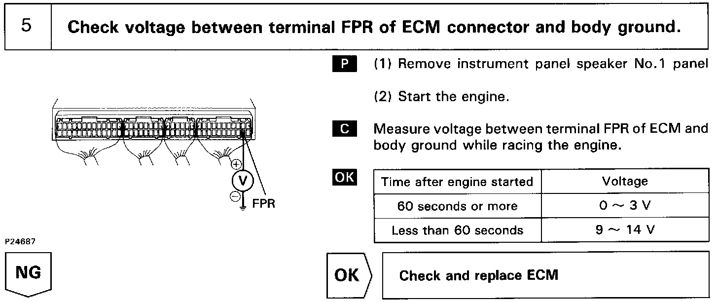 The fuel pump speed is controlled at two levels (high speed or low speed) by the condition of the engine (starting, light load, heavy load). When the engine starts (STA ON), Tr2 in the ECM is OFF, so battery voltage is applied directly to the fuel pump. Fuel pump operates at high speed.