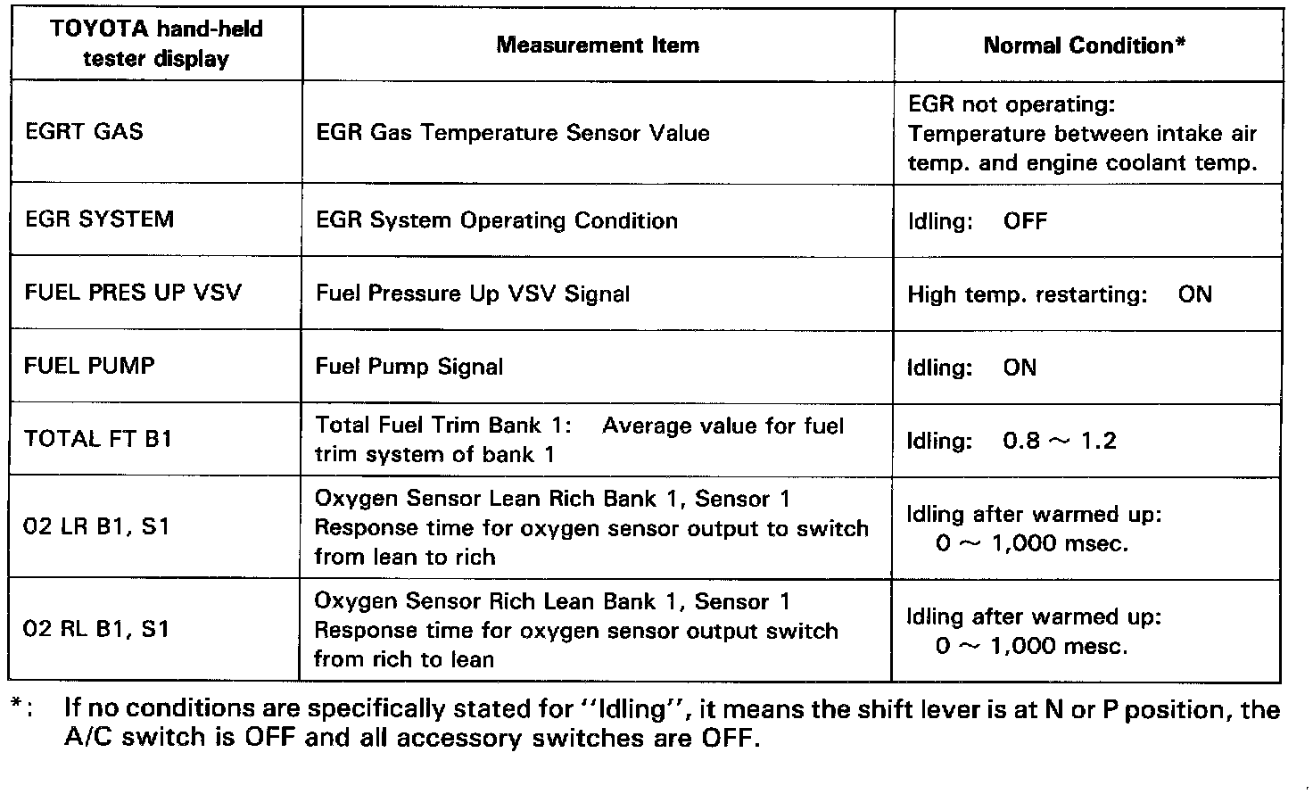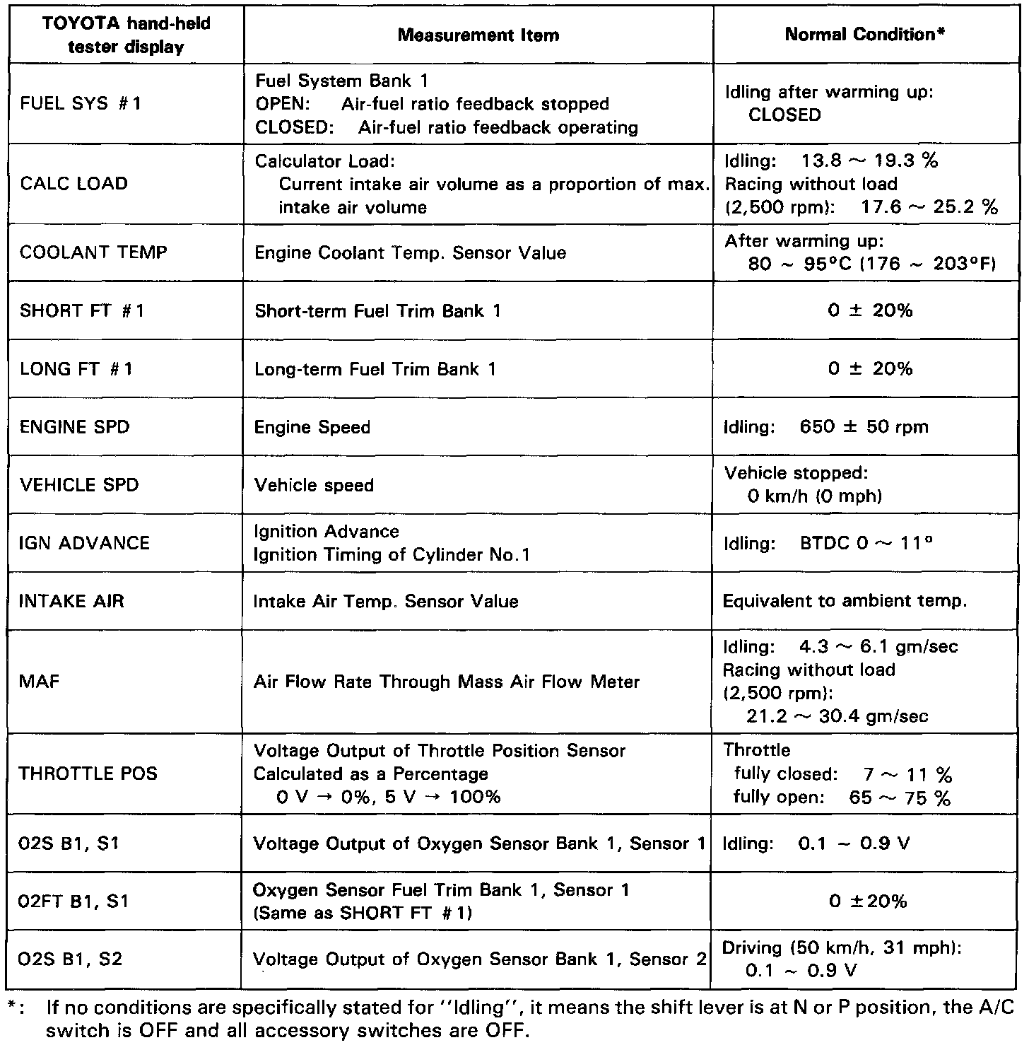 NOTICE: The values given below for "Normal Condition" are representative values, so a vehicle may still be normal even if its value varies from those listed here. So do not decide whether a part is faulty or not solely according to the "Normal Condition" here.