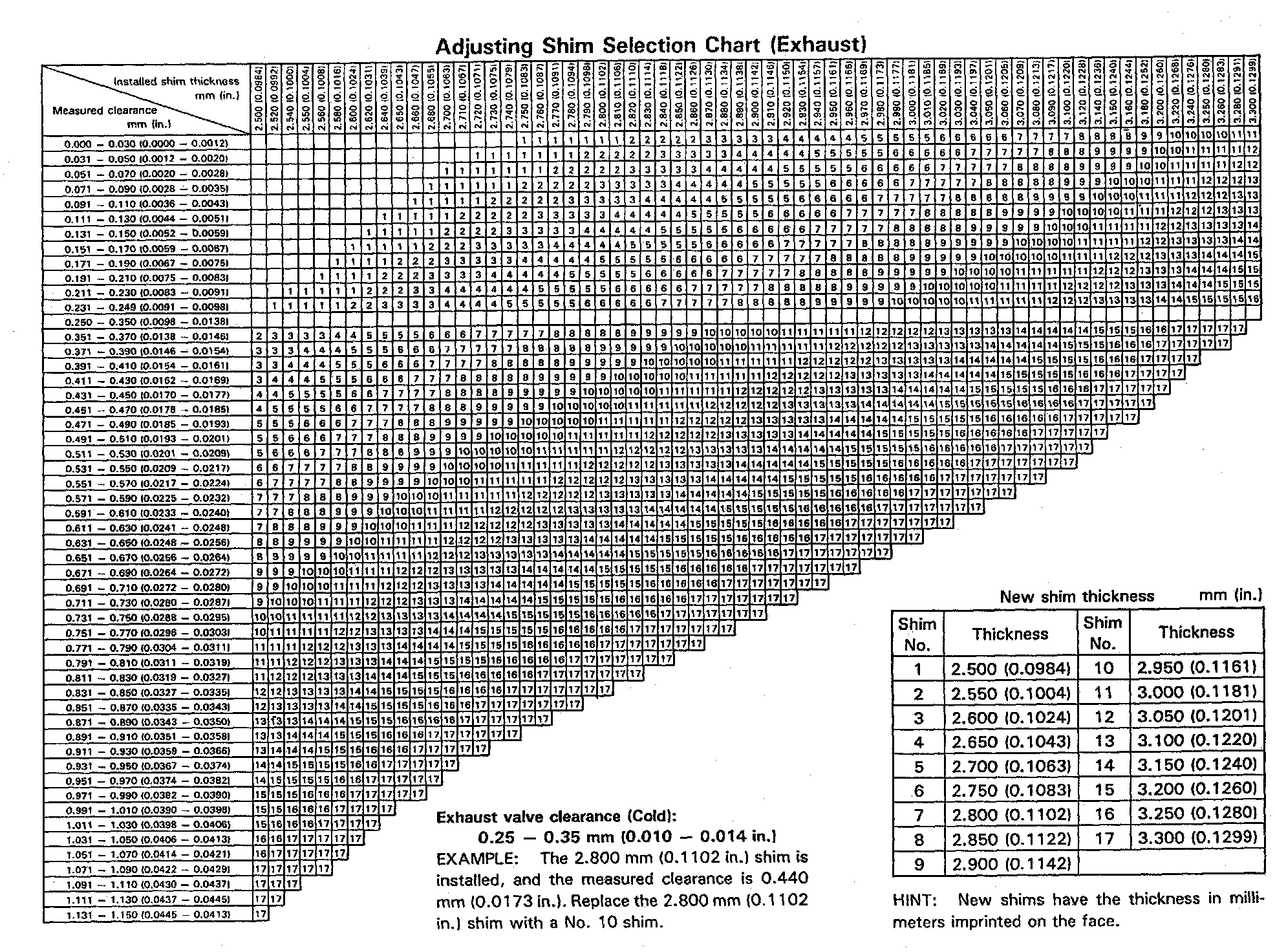 Adjusting Shim Selection Chart (Exhaust):