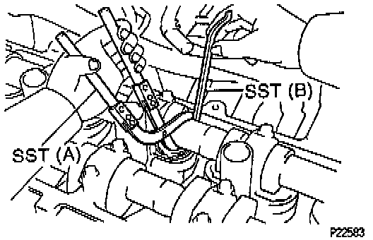 ^ Using SST Valve Clearance Adjust Tool Set # 09248 - 55050 or (A) (Valve Lifter Press # 09248 - 05510), press down the valve lifter and remove SST (B) Valve Lifter Stopper # 09248 - 06020 or equivalents.