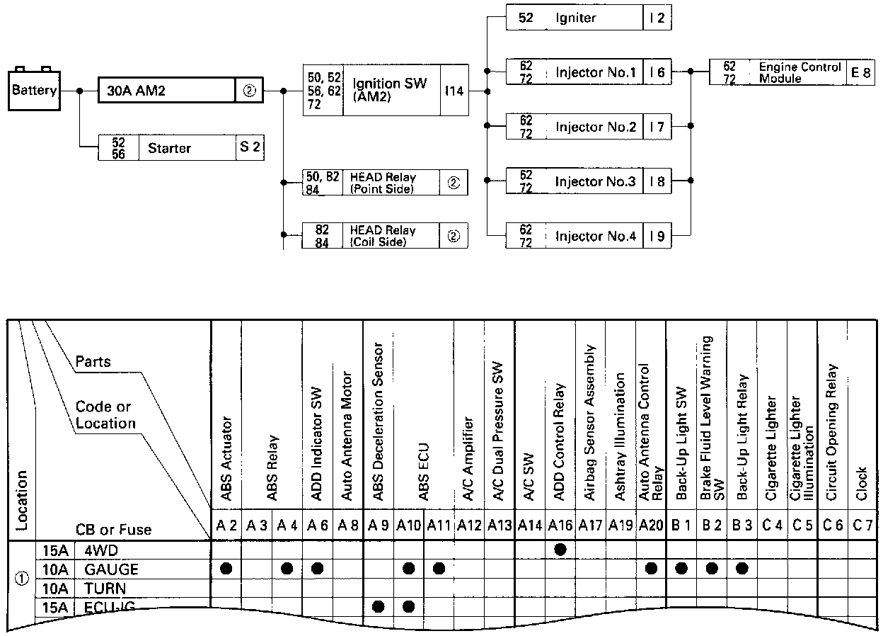 The chart shows the route by which current flows from the battery to each electrical source (Fusible Link, circuit Breaker, Fuse, etc.) and other parts.