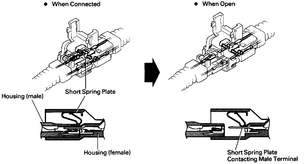 Each connector contains a short spring plate. When the connector is disconnected, the short spring plate automatically connects the power source and grounding terminals of the squib to preclude a potential difference between the terminals.