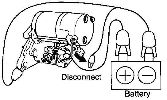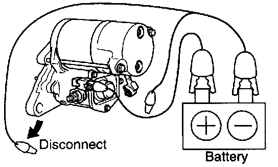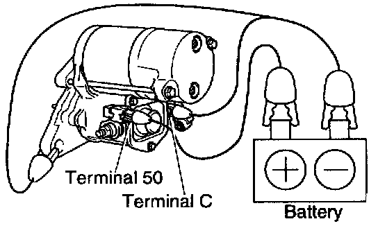 With battery connected as shown with the clutch pinion gear out, disconnect the negative (-) lead from terminal C. Check that the pinion gear remains out.
