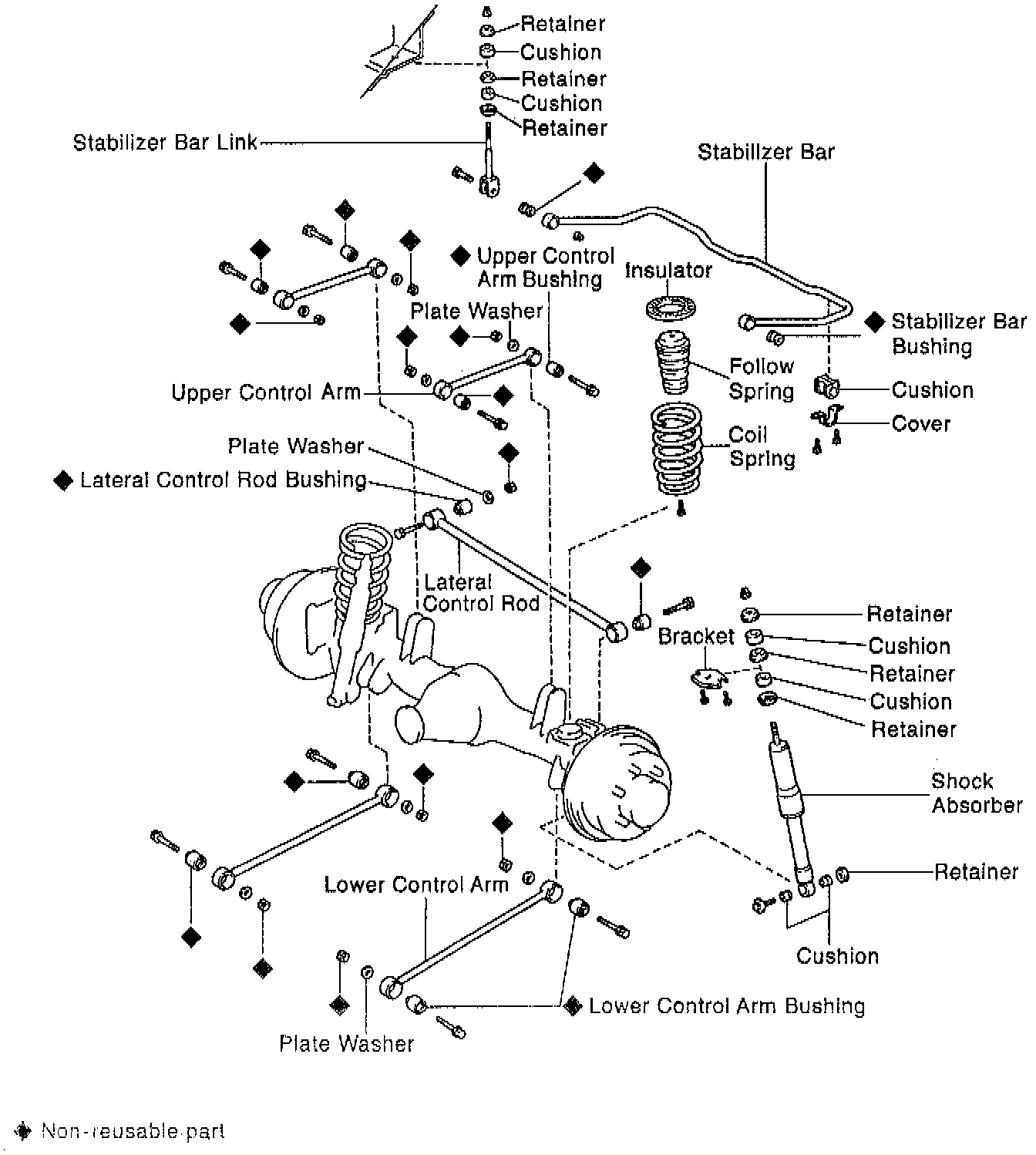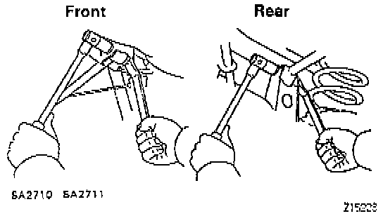 2. Remove the upper control arm by removing the 2 nuts, plate washers, bolts and upper control arm from the frame.