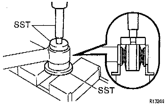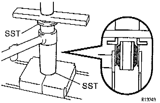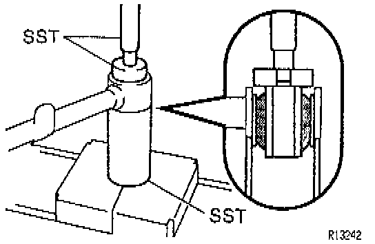 1. Replace the upper control arm bushing by using the 09226 - 10010, 09950 - 60010 (09951 - 00490), 09950 - 70010 (09951 - 07100) SSTs and a press, remove the bushing then, by using the 09226 - 10010, 09506 - 35010 SST and a press, install a new bushing.