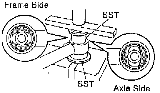 2. Replace the lower control arm bushing by using the 09506 -35010, 09950 - 60010 (09951 - 00540), 09950-70010 (09951 -07100) SST and a press to remove the bushing then, by using the 09316 - 20011, 09506 - 35010 SSTs and a press, install a new bushing, as shown.