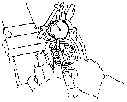 d. Using a dial indicator, measure the side gear backlash with holding one pinion gear toward the case, the measurement should be 0.05 - 0.20 mm (0.0020 - 0.0079 inch). If the backlash is not within the specification, install thrust washer of different thickness.