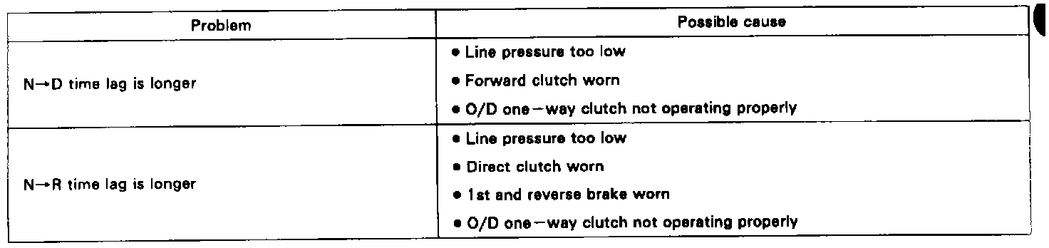 When the shift lever is shifted while the engine is idling, there will be a certain time lapse or lag before the shock can be felt. This is used for checking the condition of the O/D direct clutch, forward clutch, direct clutch, and 1st and reverse brake.