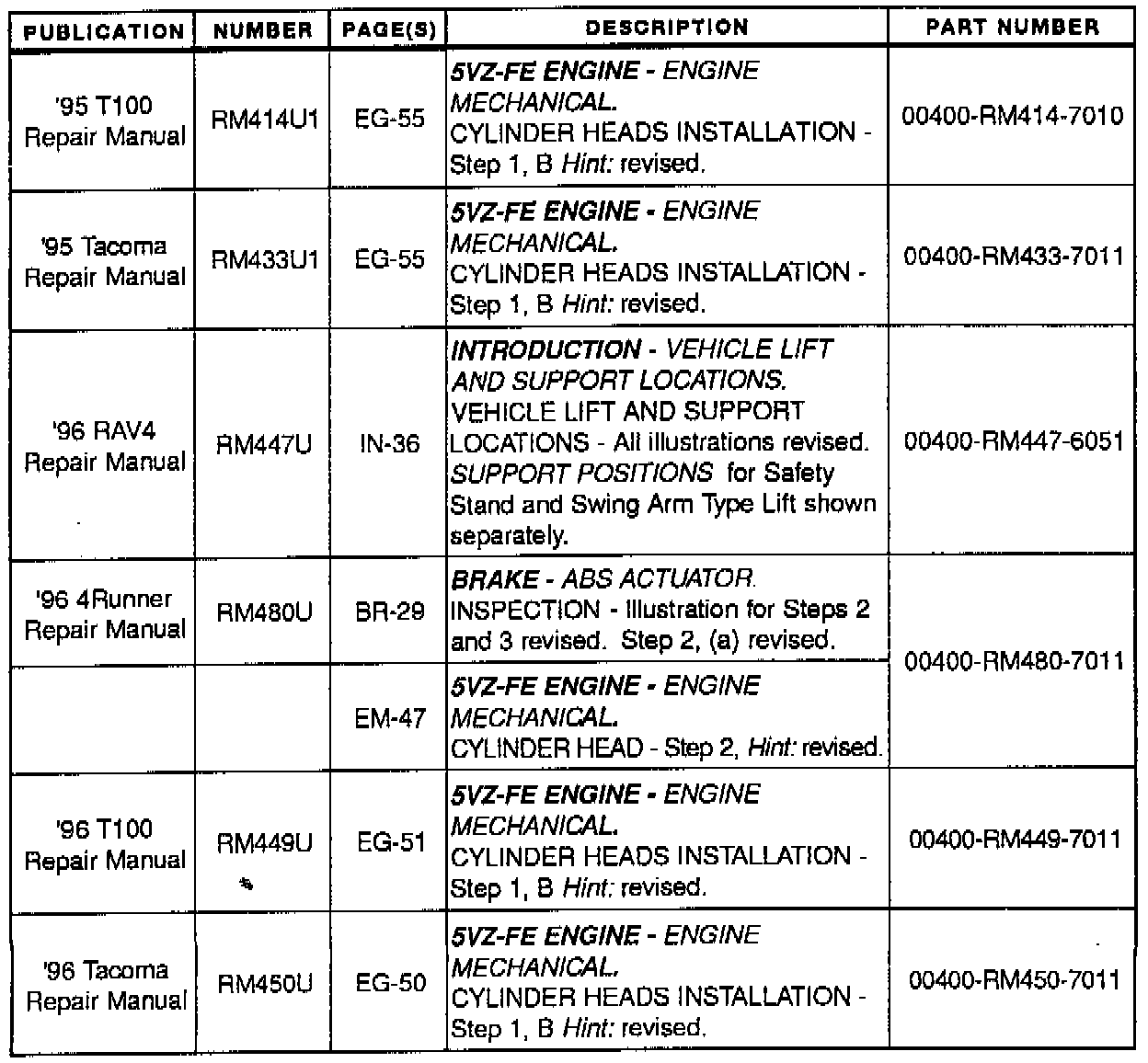 Corrections have been made in the repair manuals listed below. A brief description of each correction is provided. Please insert these correction pages in their corresponding publication.