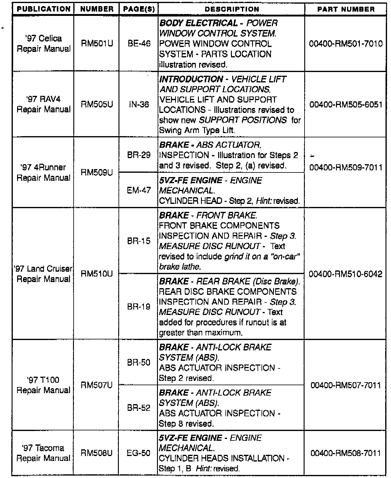 Repair Manual Corrections - Engine/Brakes/Windows