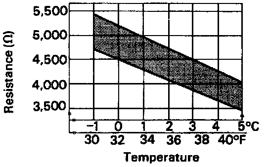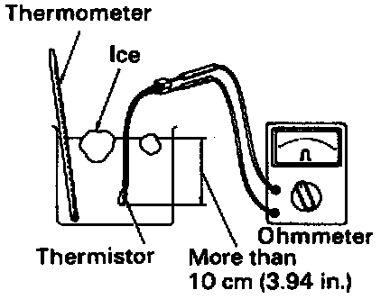 1. Place the thermistor in cold water. While changing temperature of the water, measure resistance at the connector and, at the same time, measure the temperature of the water with a thermometer.
