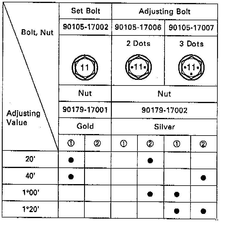 If the camber is not within specification, using the table and estimate of how much additional camber adjustment will be required, select the camber adjusting bolt.