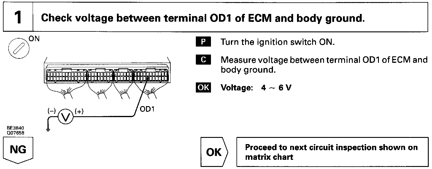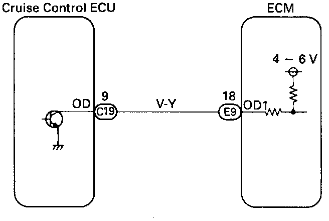 The cruise control ECU sends O/D cut signals to the ECM as necessary and the ECM cancels O/D shifting until these signals are discontinued.