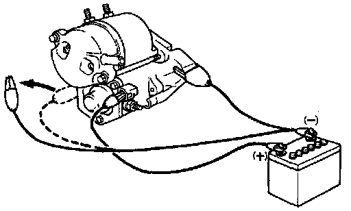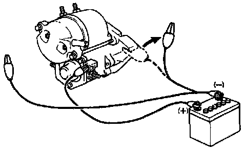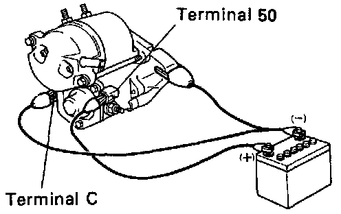 With battery connected as above with the clutch pinion gear out, disconnect the negative (-) lead from terminal C. Check that the pinion gear remains out.