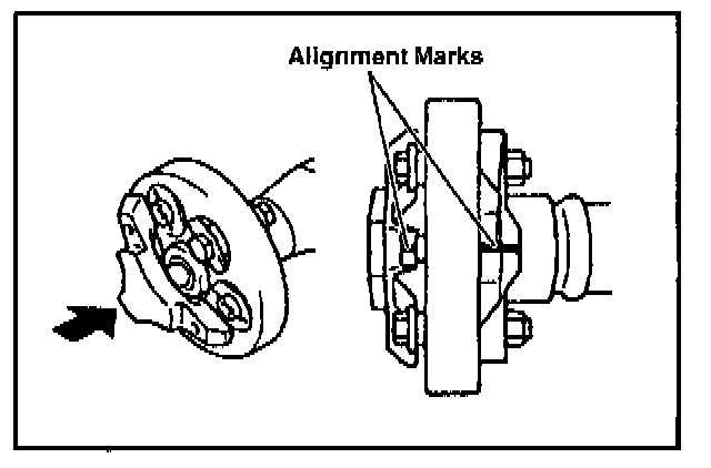 E. From the flexible coupling side, install the 3 new bolts and washers, and tighten the 3 new nuts from the propeller shaft side, then tighten to engage the collar.