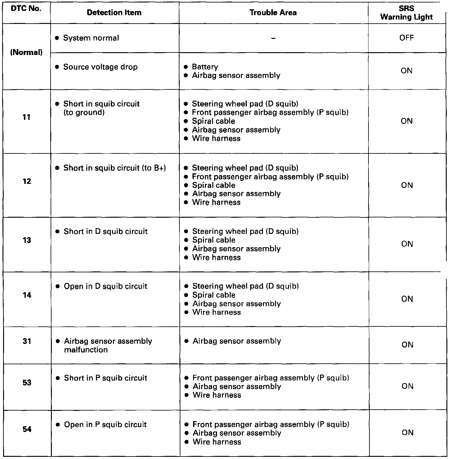 - If a code not listed on the chart is displayed, the airbag sensor assembly is faulty.