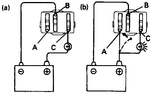 1. Connect the positive (+) lead from the battery to terminal C through a 1.4 W test bulb and the negative (-) lead to terminal B. and check that the test bulb does not light up.