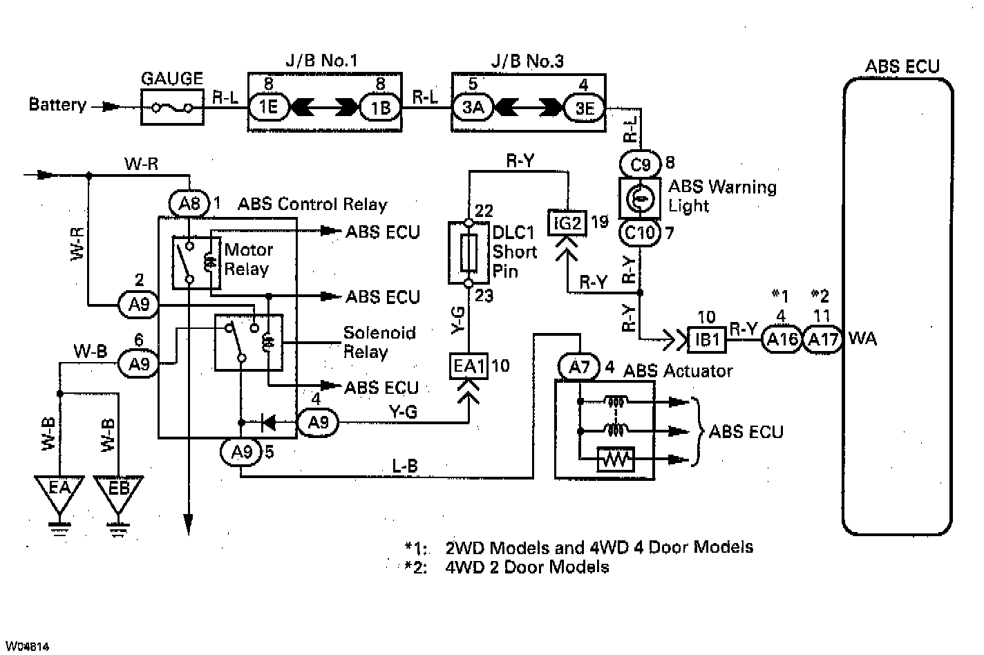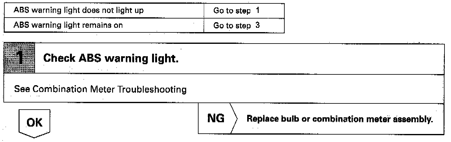 If the Electronic Control Unit (ECU) detects trouble, it lights the Anti-Lock Brake System (ABS) Warning Light while at the same time prohibiting ABS control. At this time, the ECU records a Diagnostic Trouble Code (DTC) in memory.