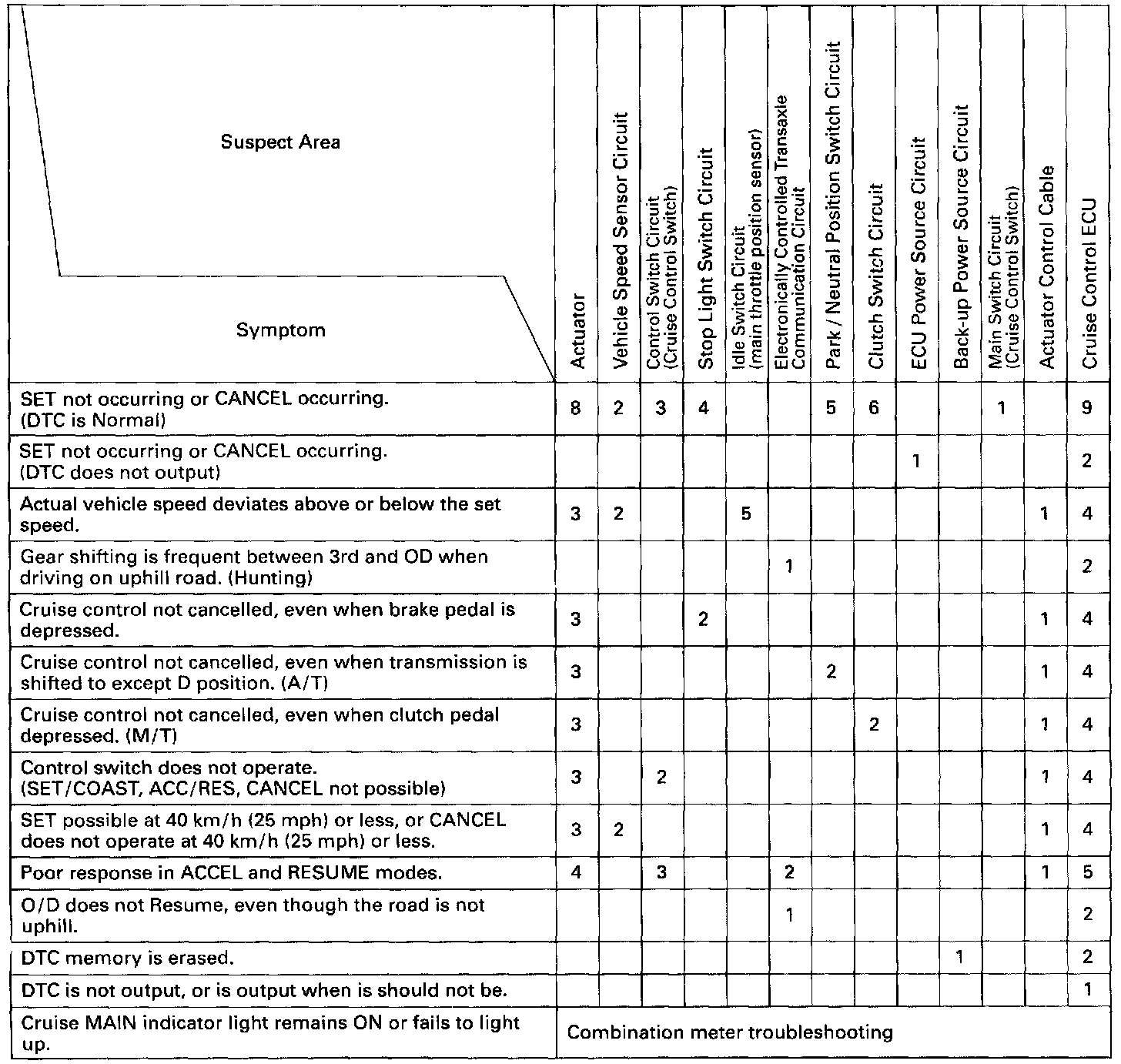 If a normal code is displayed during the DTC check but the trouble still occurs (reappears), troubleshoot for each problem symptom, checking the circuits for each symptom in the order given in the table.