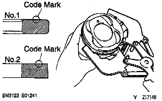 (b) Using a piston ring expander, install the 2 compression rings with the code mark facing upward.