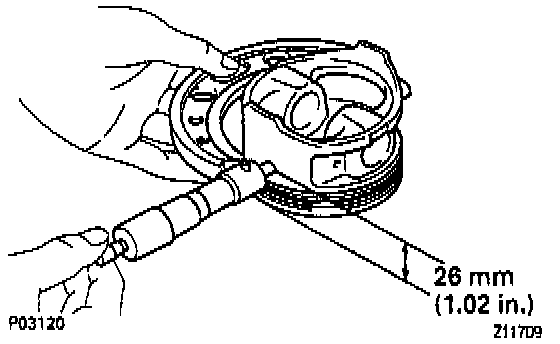 (a) Using a micrometer, measure the piston diameter at right angles to the piston pin center line, 26 mm (1.02 inch) from the piston head.