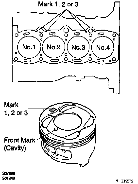 NOTE: (Use new cylinder block): Use a piston with the same number mark as the cylinder bore diameter marked on the cylinder block.