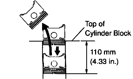 (b) Using a piston, push the piston ring a little beyond the bottom of the ring travel, 110 mm (4.33 inch) from the top of the cylinder block.