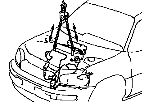 (b) Slowly lower the vehicle, and raise the engine into the engine compartment.