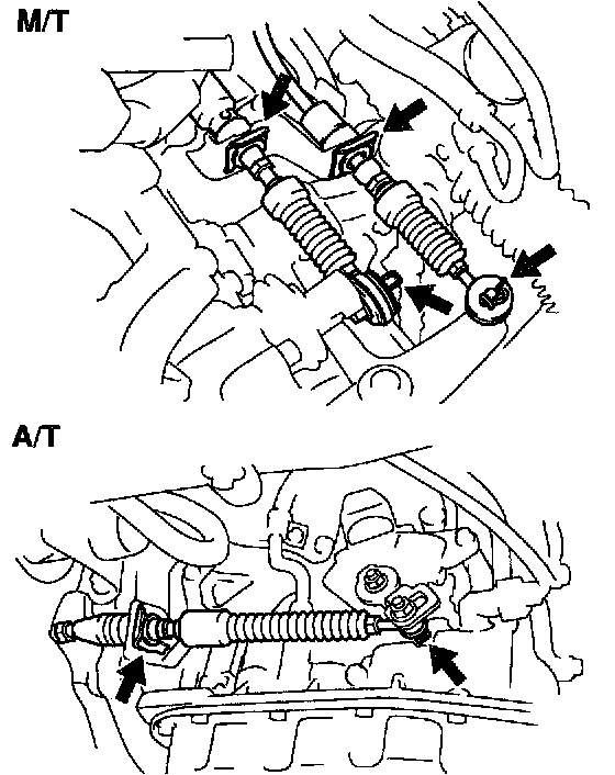 17. A/T only: Install transaxle control cable to front suspension crossmember and engine mounting center member.