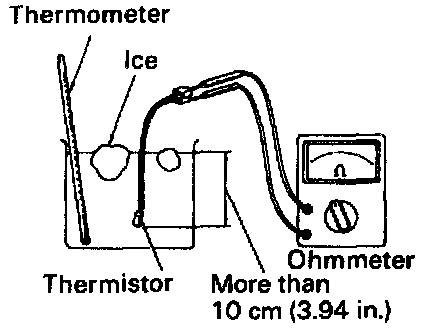 a. Place the thermistor in cold water, and while changing the temperature of water, measure resistance at the connector and at the same time, measure temperature of water with a thermometer.
