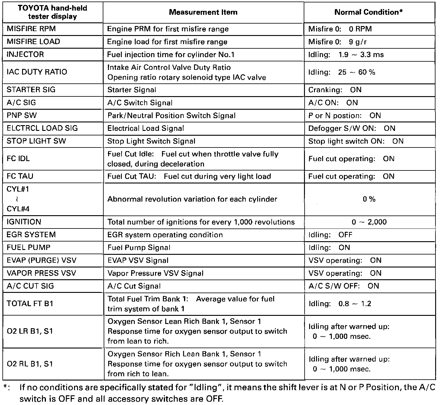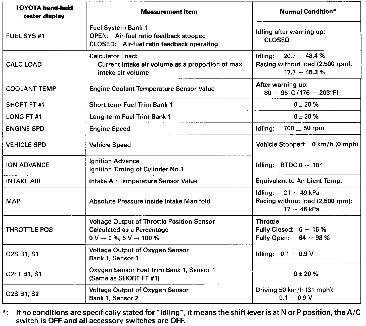 NOTICE: The values given below for "Normal Condition" are representative values, so a vehicle may still be normal even if its value varies from those listed here. So do not decide whether a part is faulty or not solely according to the "Normal Condition" here.