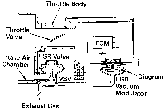 The EGR system recirculates exhaust gas, which is controlled to the proper quantity to suit the driving conditions, into the intake air mixture to slow down combustion, reduce the combustion temperature and reduce NOx emissions. The amount of EGR is regulated by the EGR vacuum modulator according to the engine load.