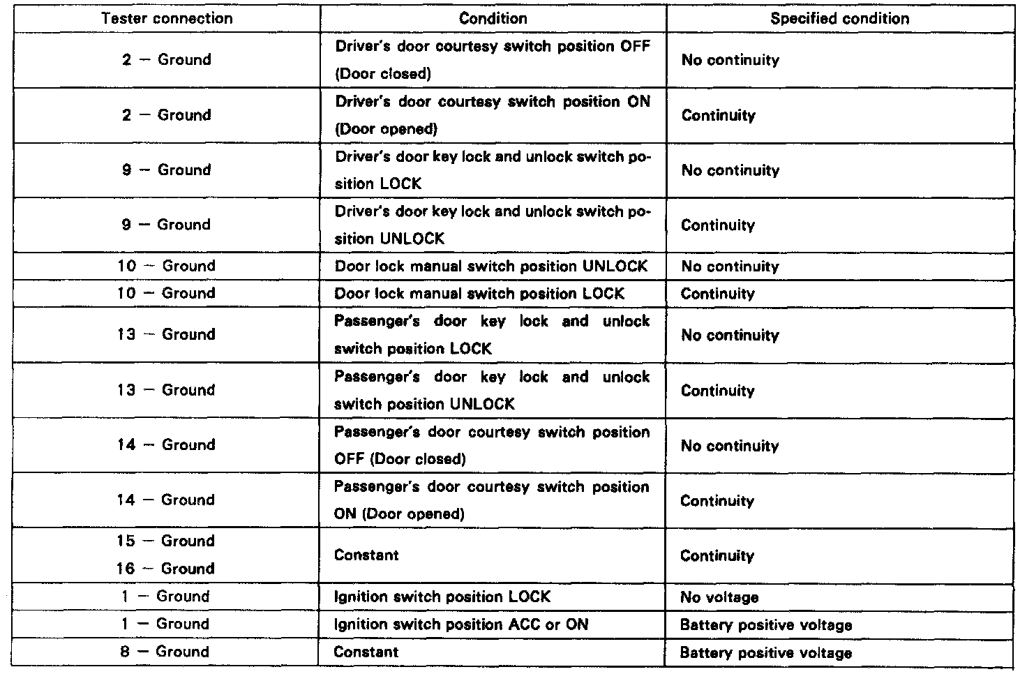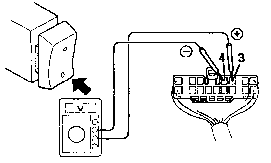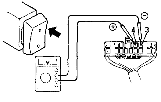 3. Set the door lock manual switch to UNLOCK, check that the voltage rises from 0 volts to battery voltage for approximately 0.2 seconds.