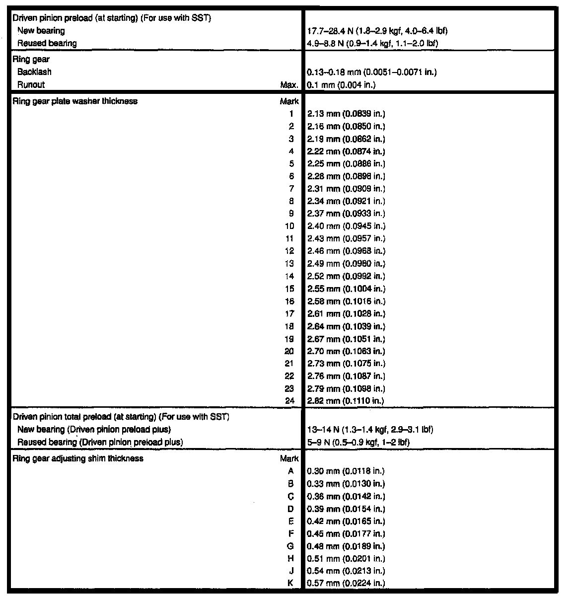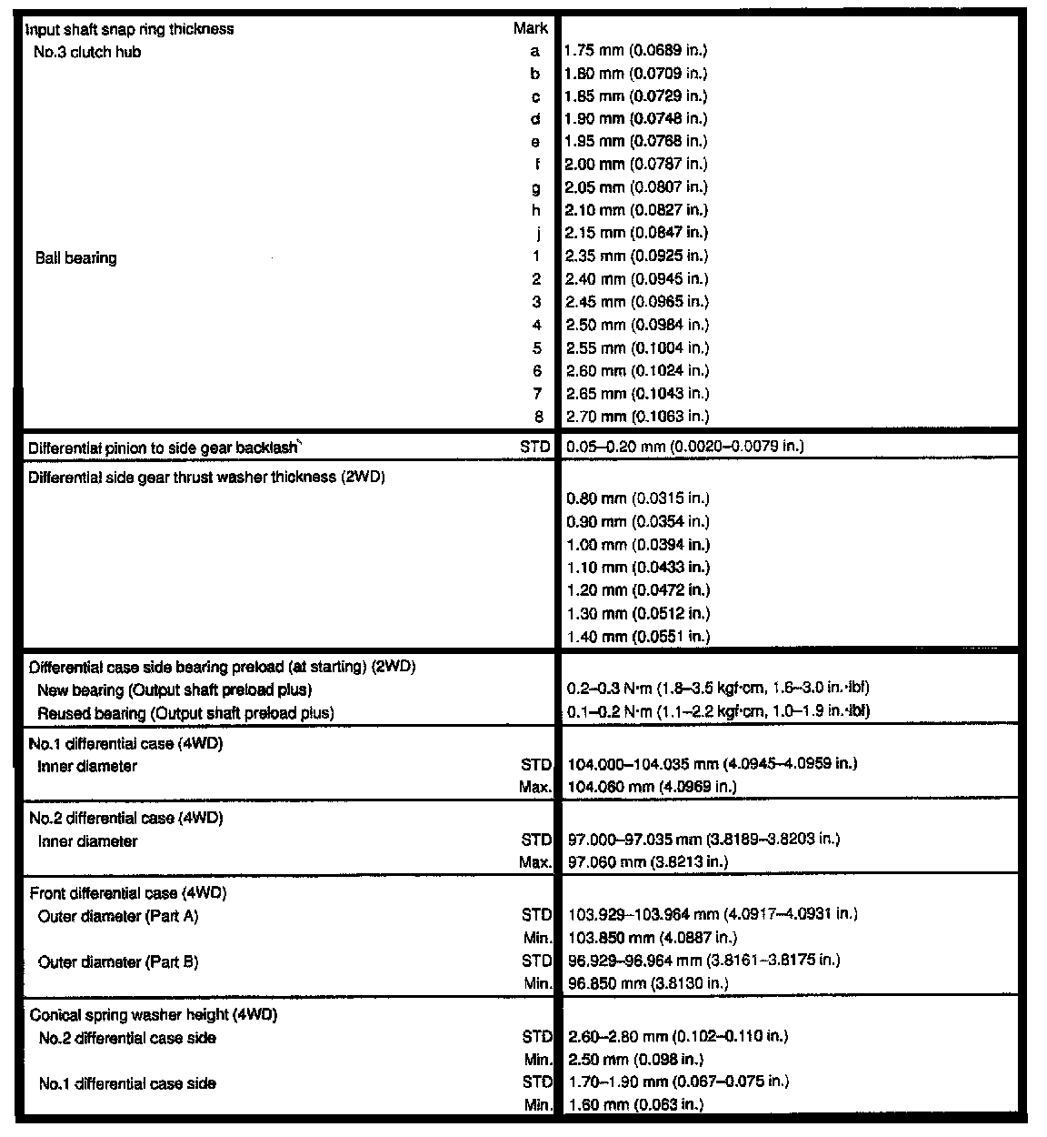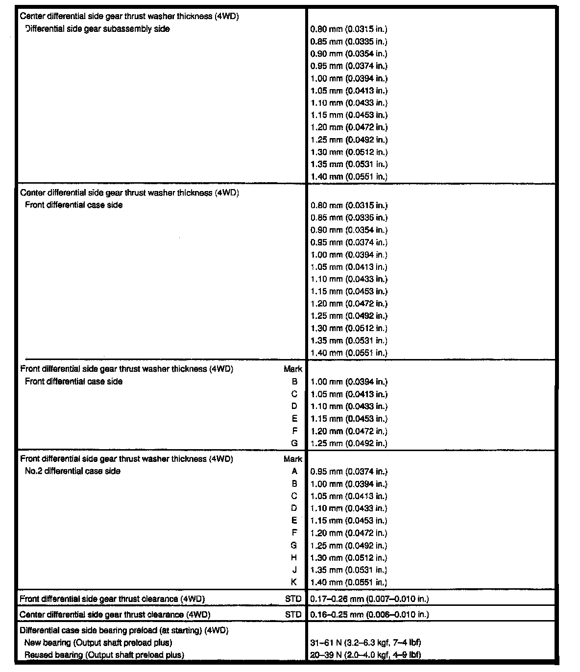 5-spd M/T, Differential Thickness/Front Gear Clearance: