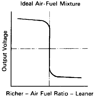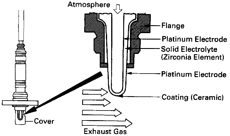 The oxygen sensor has the characteristic whereby its output voltage changes suddenly in the vicinity of the stoichiometric air-fuel ratio. This characteristic is used to detect the oxygen concentration in the exhaust gas and provide feedback to the computer for control of the air-fuel ratio.