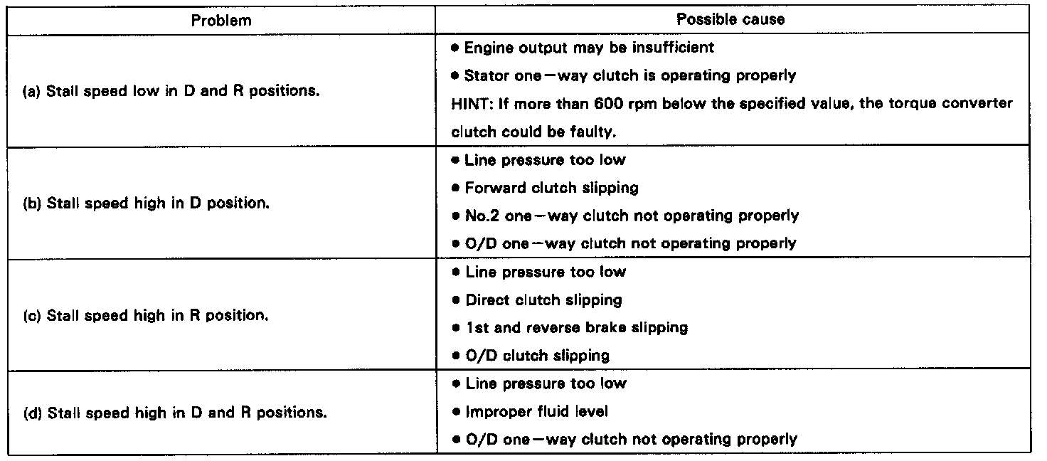 The object of this test is to check the overall performance of the transaxle and engine by measuring the stall speeds in the D and R positions.