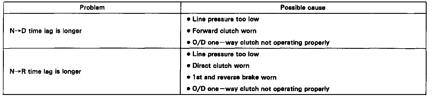 When the shift lever is shifted while the engine is idling. there will be a certain time lapse or lag before the shock can be felt. This is used for checking the condition of the O/D direct clutch, forward clutch, direct clutch, and 1st and reverse brake.