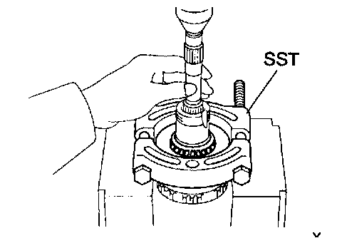 Using SST and a press, press out the bearing from the shaft.