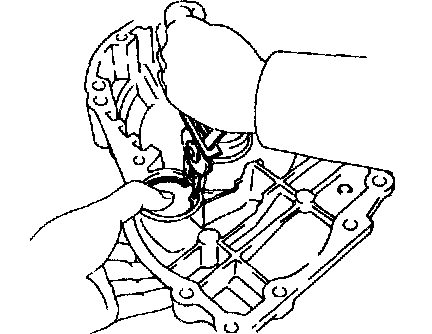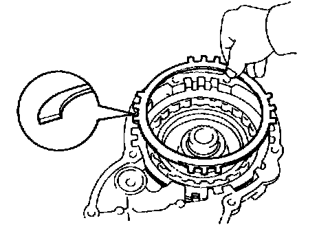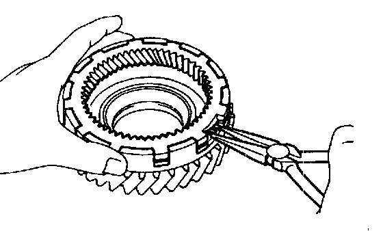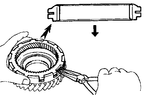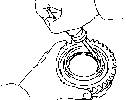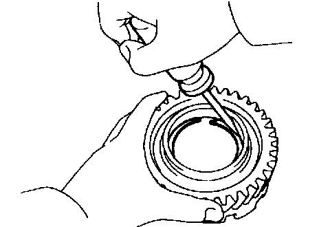 b. While pushing down the ring gear, squeeze the snap ring end with needle-nose pliers, and install it into the groove.