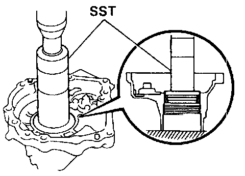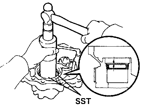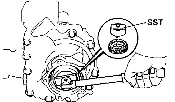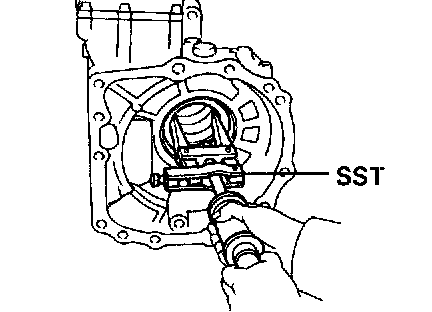 10. REMOVE DIFFERENTIAL LEFT SIDE BEARING OUTER RACE AND PLATE WASHER Using SST, remove the outer race and plate washer.