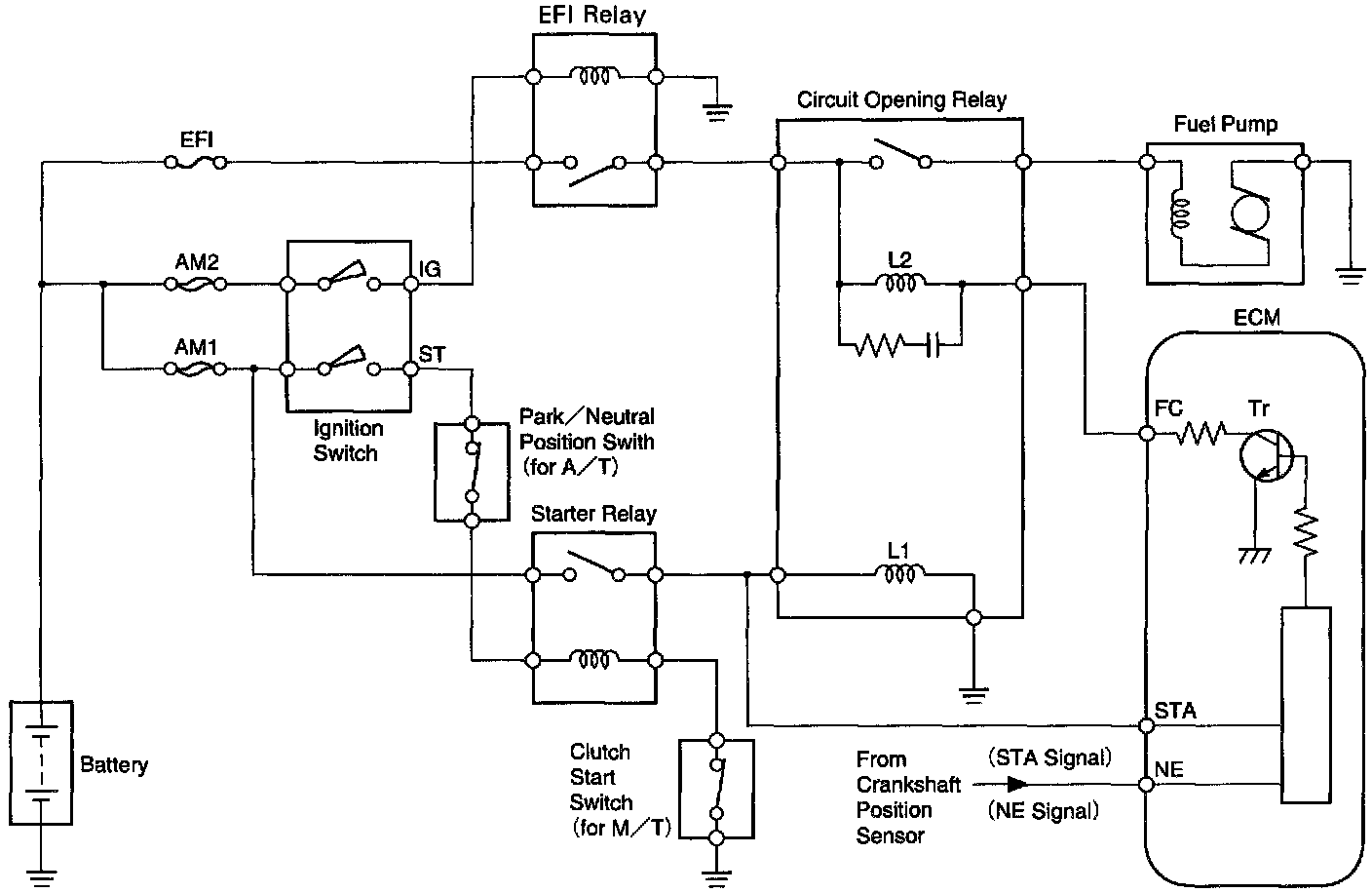 When the STA signal and NE signal are input to the ECM, Tr is turned ON, current flows to coil L2 of the circuit opening relay, the relay switches on and the fuel pump operates.