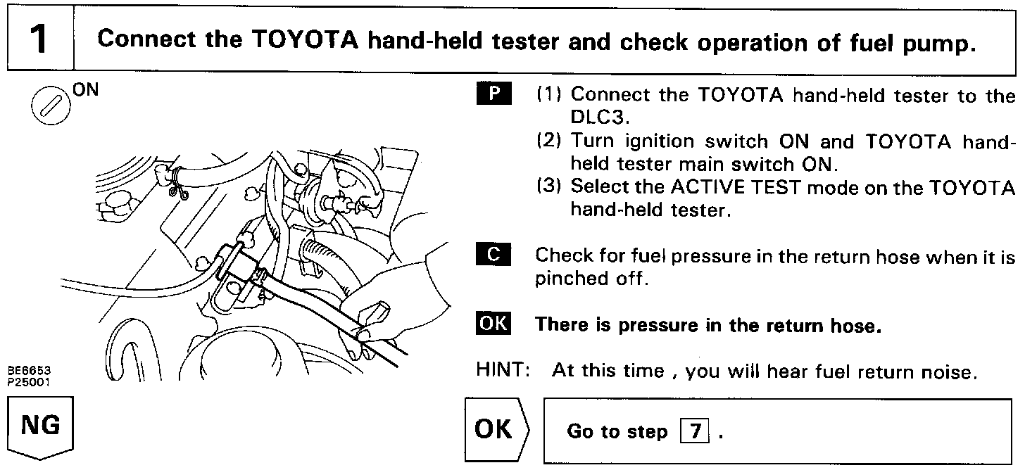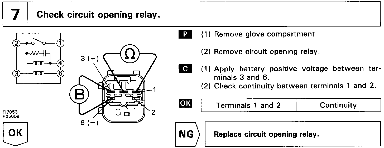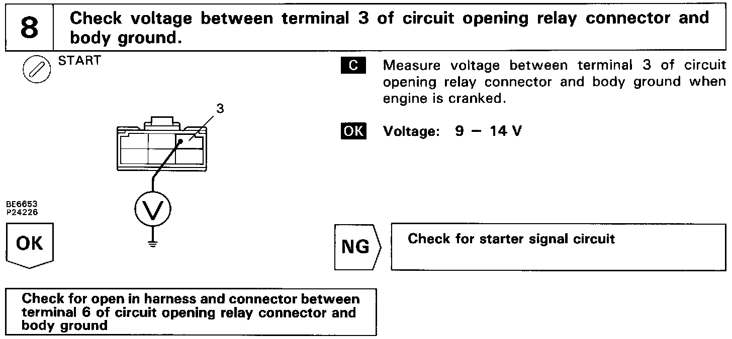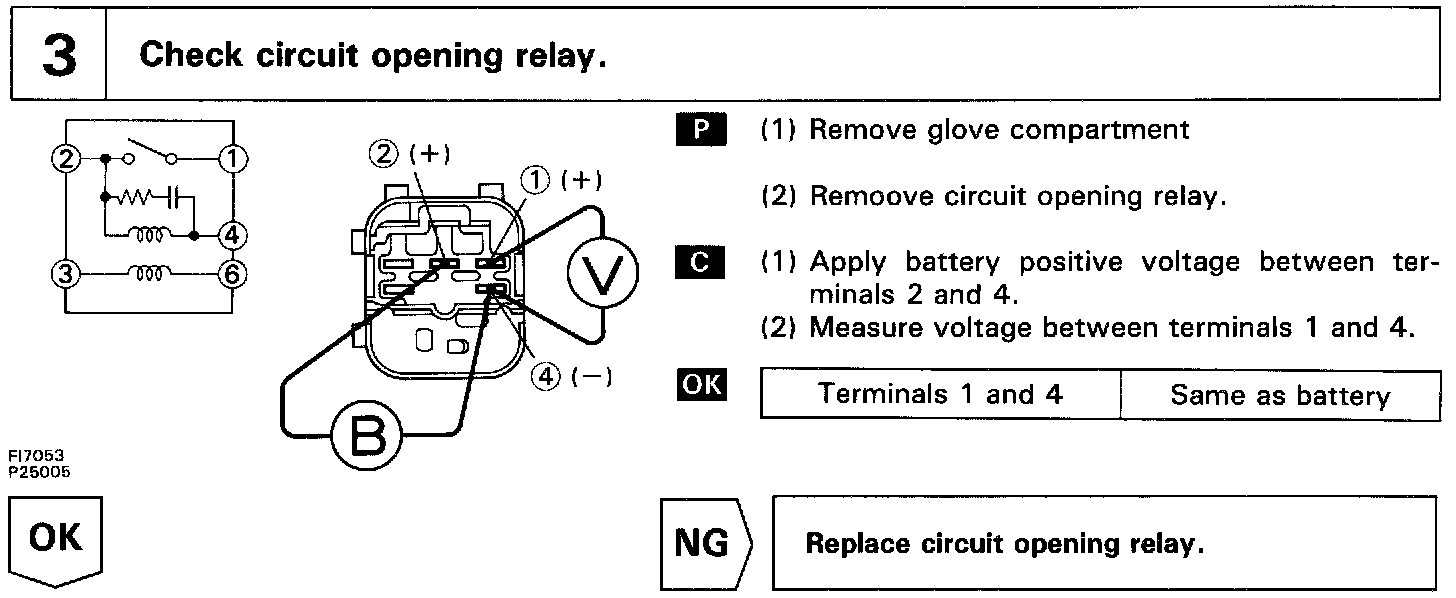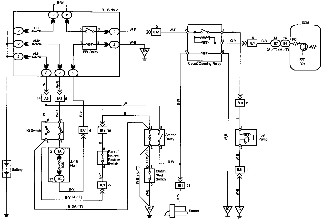 In the diagram below, when the engine is cranked, current flows from terminal ST of the ignition switch to the starter relay coil, the starter relay switches on and current flows to coil L1 of the circuit opening relay. Thus the circuit opening relay switches on, power is supplied to the fuel pump and the fuel pump operates.