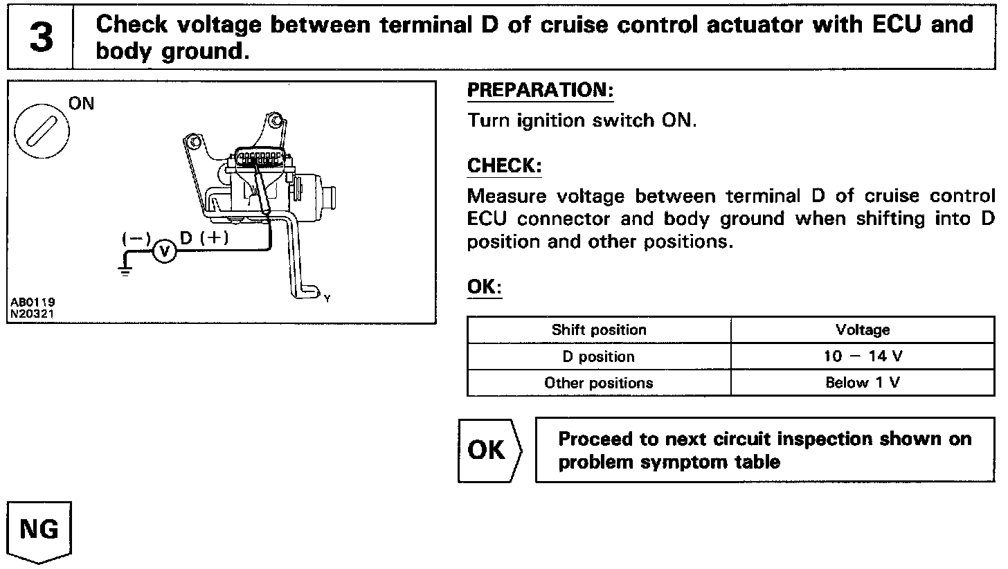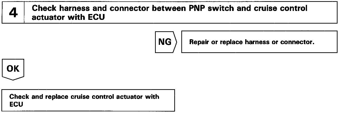 When the shift position is put in except D position, a signal is sent from the park/neutral position switch to the ECU. When this signal is input during cruise control driving, the ECU cancels the cruise control.