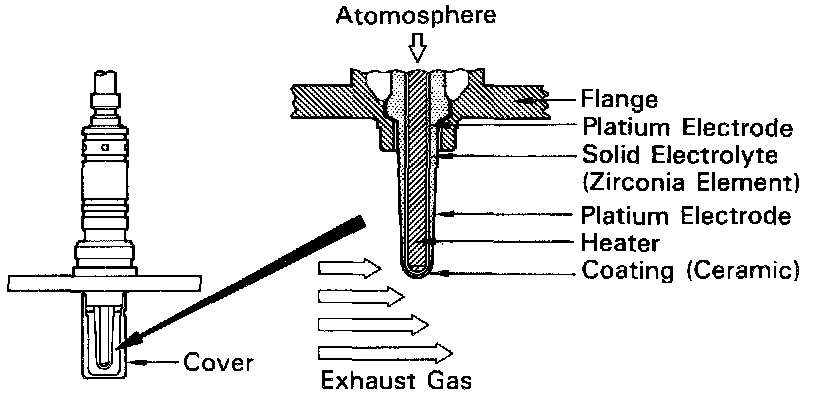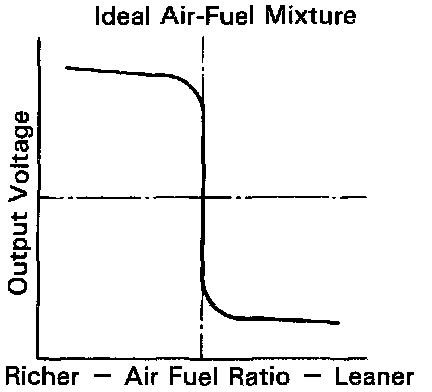 The oxygen sensor has the characteristic whereby its output voltage changes suddenly in the vicinity of the stoichiometric air-fuel ratio. This characteristic is used to detect the oxygen concentration in the exhaust gas and provide feedback to the computer for control of the air-fuel ratio.