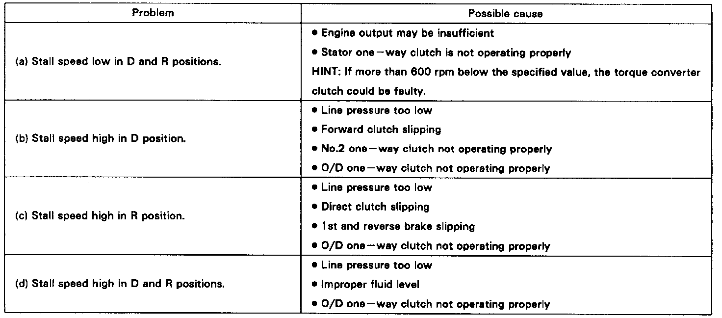 The object of this test is to check the overall performance of the transmission and engine by measuring the stall speeds in the D and R positions.