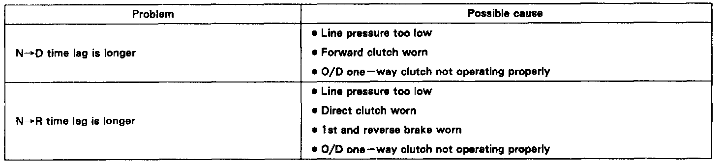 When the shift lever is shifted while the engine is idling. there will be a certain time lapse or lag before the shock can be felt. This is used for checking the condition of the O/D direct clutch, forward clutch, direct clutch, and 1st and reverse brake.